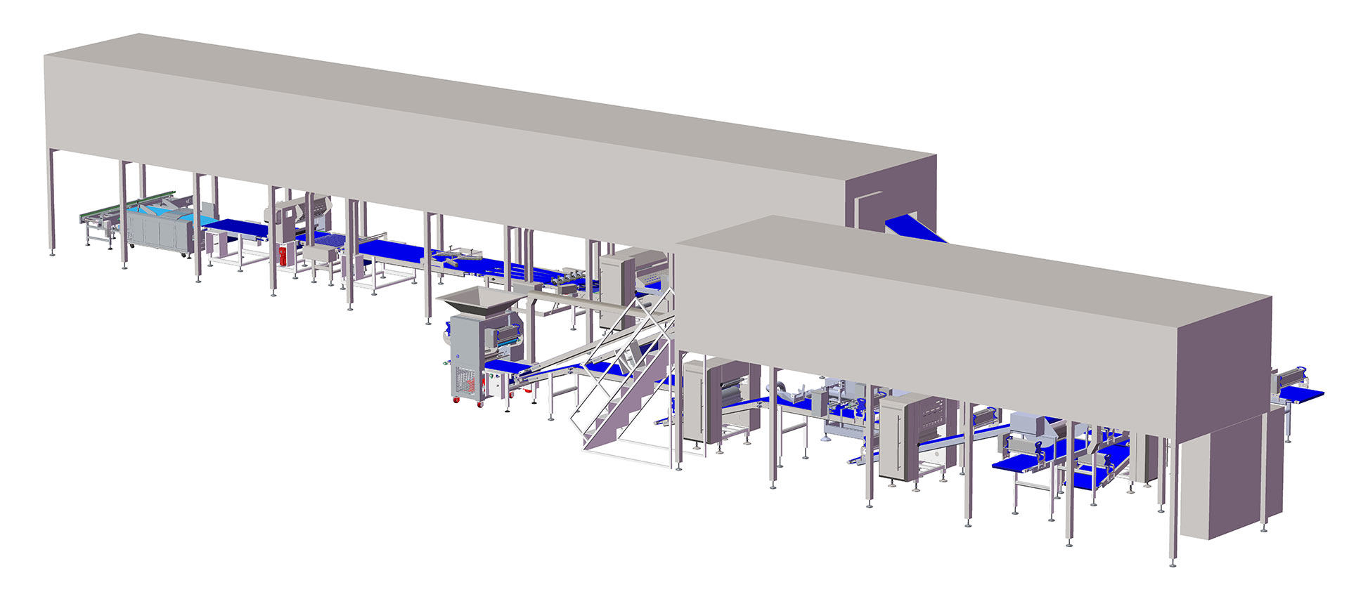 Tolva de masa y extrusora - Congelador - Calibrador - Bomba de grasa - Unidad de alimentación y plegado de mantequilla - Satélite - Laminadora - Satélite - Guillotina - Laminadora retráctil - Satélite - Congelador rápido - Satélite - Satélite - Laminadora transversal - Calibrador - Calibrador - Barredora de harina - Divisora de tiras de masa - Unidad separadora de tiras de masa - Mesa de formado - Unidad de cierre de tiras de masa - Guillotina - Máquina de moldeo